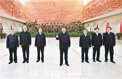 10月27日,中共中央總書記、國家主席、中央軍委主席習近平帶領中共中央政治局常委李強、趙樂際、王滬寧、蔡奇、丁薛祥、李希,瞻仰延安革命紀念地。這是習近平在延安革命紀念館參觀《偉大歷程——中共中央在延安十三年歷史陳列》結束時發表重要講話。 新華社記者 燕 雁攝